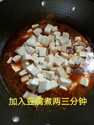 5. 放入姜末、酱油、辣椒粉炒出红油后,再加入肉汤(或水)100克,倒入豆腐烧3分钟