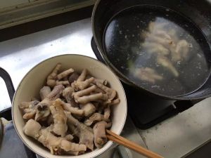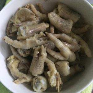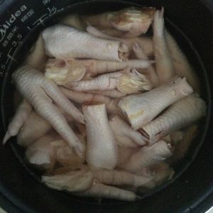 将烧好的鸡爪盛出,反复用凉水冲洗,去掉油脂。放在一边把水控干。