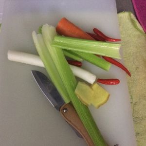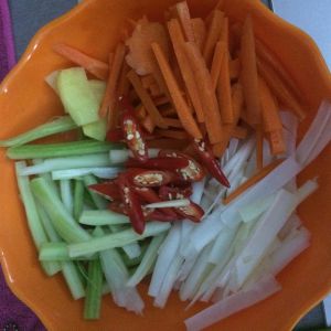 西芹,葱分别切1寸长段,姜切成丝备用。