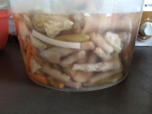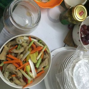 再将提前泡好的泡菜和煮好的凤爪泡在一起