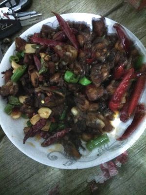 一直翻炒直干辣子香味出来,下姜片,葱段,青辣子,花椒,干炒至香味出来,加盐后炒至入味,土鸡比较难入味。