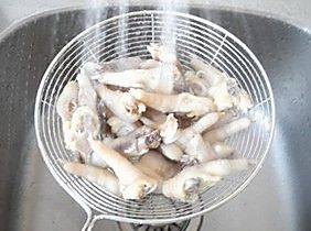 冷水下锅,煮沸后捞出,这个步骤可以去除鸡爪表面的油脂和杂质。