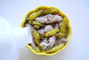 十分钟后捞出,洗干净后放入冰水里,使凤爪皮收缩,这样口感比较爽脆。取一容器,放入切好的蒜,小米椒,柠檬,香菜,放一勺白糖和盐,再倒一些酱油和醋,这个量需要自己按凤爪的量自己掌握的。拌匀后放到冰箱冷藏五个小时以上(如放一晚味道更佳)就可以食用了。