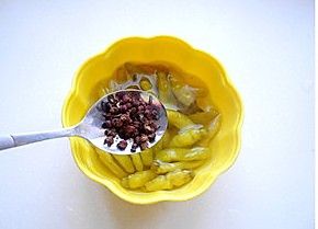 把焯好洗净的凤爪放到调制好的野山椒里,做好将野山椒和凤爪错落放置,利于入味。倒入饮用水,让凤爪完全浸泡在野山椒的汤汁里。