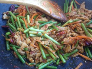 锅中油热炒香葱姜蒜,加入肉丝翻炒。