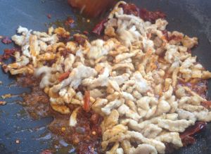 再放入过好油的肉丝,翻炒,加入调好的汁。