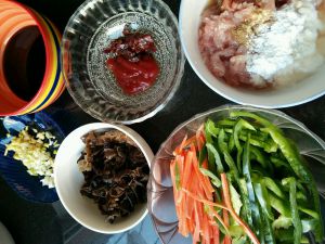 将各种食材准备好,胡萝卜、青椒、木耳切丝;葱、姜、蒜切沫;把郫县豆瓣酱和番茄酱准备好;把糖、醋、生抽、耗油、盐调在一起待用;把里脊肉切丝,放盐、生抽、淀粉腌一会儿待用。