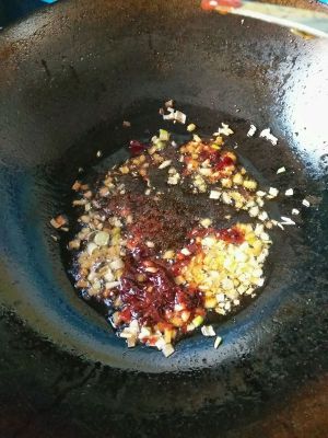 锅里放油,加入蒜末炒香,加入一勺郫县豆瓣酱,小火炒出红油