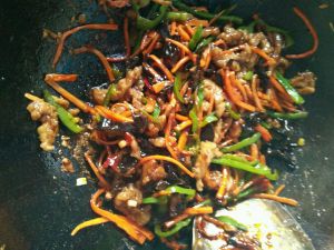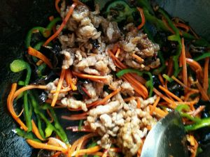 再加入胡萝卜丝、木耳丝、青椒丝,继续翻炒。