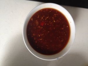 姜一小段,蒜四瓣,红辣椒酱两勺。姜蒜切沫,与辣椒酱拌匀