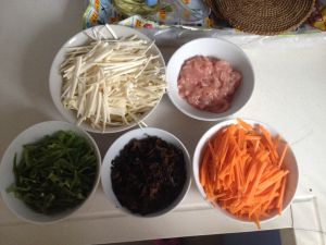 将香菇切成香菇丁,胡萝卜,青椒,木耳切丝,猪肉切成条状。