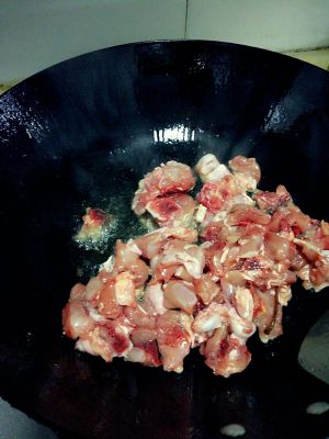 鸡腿肉带骨切丁,锅内放适量油、姜,倒入洗净切好的鸡丁煸炒!
