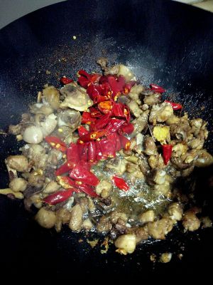 炒制的时间可以长一些,这样鸡肉会干一些(婷妈自己比较喜欢干香的口感)如果不喜欢很干的可以自己掌控一下煸炒的时间!然后投入干辣椒、花椒、盐、生抽!