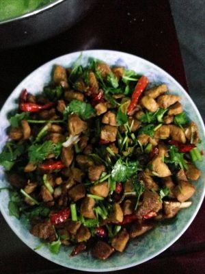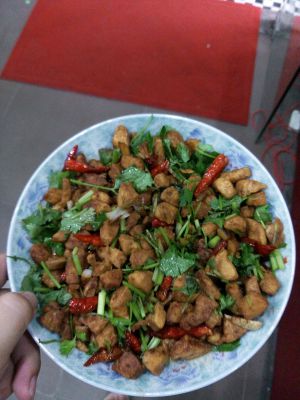 盛起,锅里还有少量油,放入葱姜蒜,干辣椒炸香,倒入炒好的鸡肉,放盐,拌均匀。加酱油上色,此时可以放一点点水,继续炒一会儿,出锅前撒入香菜。