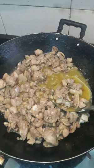 锅内倒油,八成热后倒鸡块翻炒变色后捞起