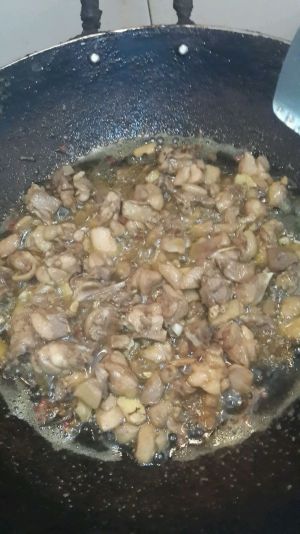 炒锅烧热,倒入一大碗菜油至滚烫,加入腌制好的鸡肉(腌制时间越久越入味)翻炒
