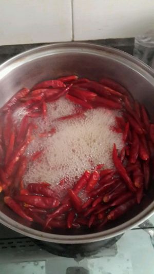在浸泡鸡肉的同时,起一口锅加水煮滚,放入干辣椒,煮至辣椒膨胀,水的颜色变渐深