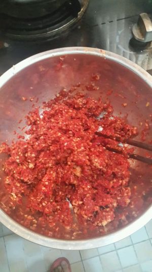 姜、蒜、煮好的辣椒磨成的泥