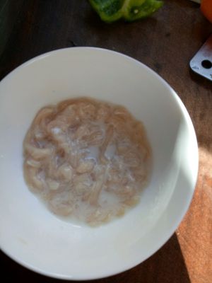 淀粉加水适量,加入醋、小磨油、白糖、葱末备用。