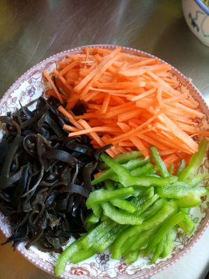 把青椒,黑木耳,胡萝卜切丝,飞水待用