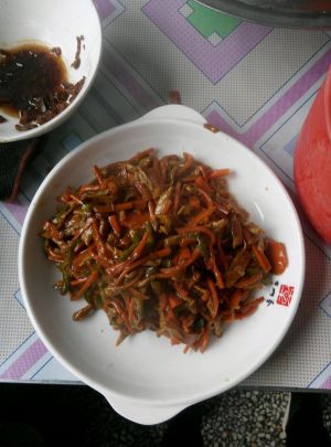 锅中留底油,蒜丝姜丝干辣椒丝炒出香味,到入胡萝卜丝,黑木耳丝,尖椒丝,翻炒,然后放入肉丝翻炒,炒至8分熟后倒入番茄沙司,米醋,白糖调至酸甜,加盐,味精,汤汁浓稠适度后出锅即可