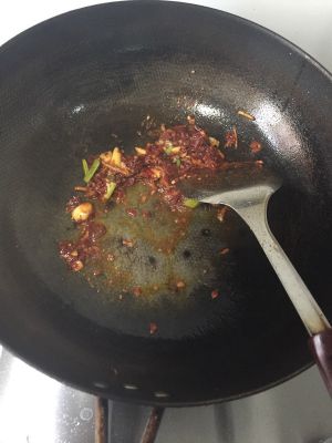 热锅放入俩勺油,放入葱段,姜片,干辣椒炸锅。然后放入郫县豆瓣酱和大红袍,小火炒化。