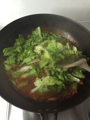 把准备的生菜下锅煮。(这个菜自己可以更换豆芽、黄瓜、芹菜、大白菜这些都可以)