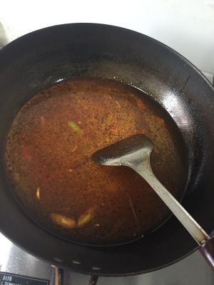 那几样佐料炒得差不多了,倒入开水。量自己把握