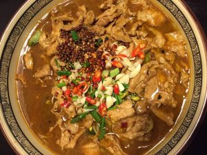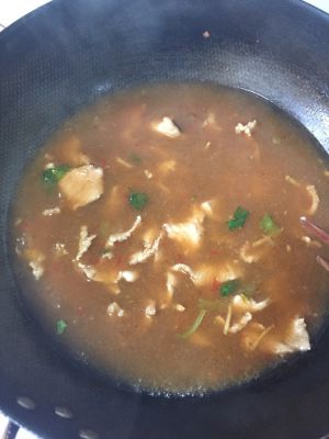 待汤很滚的时候下腌制好的肉片,边倒肉片一边要用筷子或者锅铲快速把肉片拨开以免肉结块。煮2-3分钟。(因为豆瓣酱是有咸味的,这里可以尝下咸淡怎么样,看下是否需要加盐)