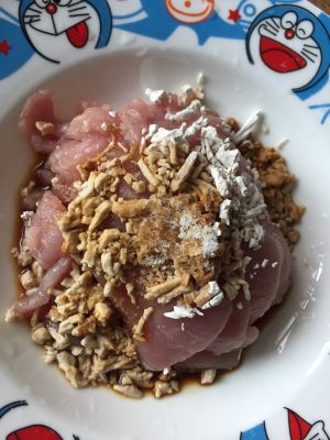 里脊肉切片加鸡蛋、油盐、味极鲜、五香面、腌制15分钟。