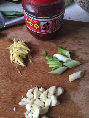 蒜姜切碎,蒜白切段。准备郫县豆瓣酱和干辣椒