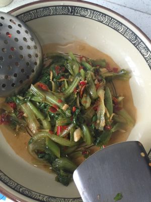 20ml油烧热,爆干辣椒至颜色程深棕色捞出滤干,剩下的油加入大蒜爆香,炝炒青菜至八分熟,捞出青菜滤干铺在碗底