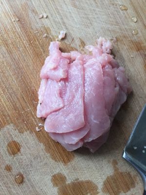 把精肉切成薄片,用淀粉料酒腌制一下备用。(个人认为里脊不太好吃))