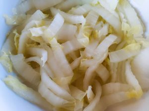 娃娃菜掰开 大片的梗可切开;黄花菜温水泡开 洗净。