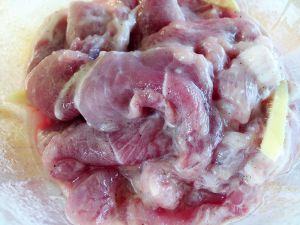 准备: 里脊肉切片,想要肉嫩好咬,一定要顶刀切片,肉片厚。(顶刀切就是看下猪肉纹理,要把纹理切段,不要顺着纹理切。)切好后,放葱姜料酒少许盐腌,加入干淀粉。