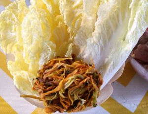 依次将煮片刻过的娃娃菜 黄花菜码入碗中。