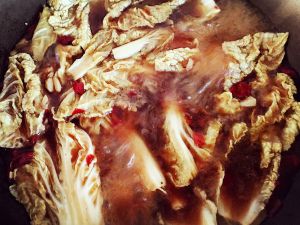 油锅下蒜泥爆香,舀入豆瓣酱,剁椒少量,爆出红油后加水煮沸,下娃娃菜叶煮片刻。