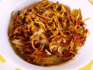 煮熟的肉和菜放在一起,上面放上辣椒,花椒,芝麻
