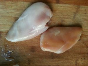 鸡胸肉切好后,放入五香粉、1小勺盐、红薯淀粉和料酒20g,腌制10分钟。