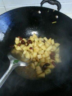 土豆快熟的时候倒入炒好鸡丁,加入盐、少量鸡精,稍微翻炒可以起锅