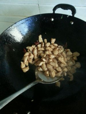 将腌好的肌肉,过油翻炒,待鸡肉颜色都变白后盛出备用!