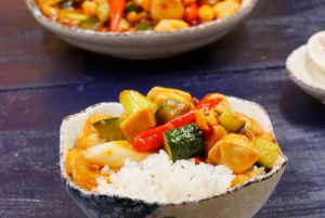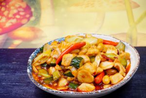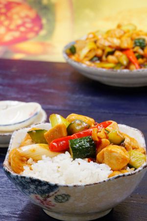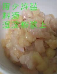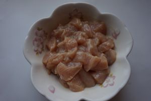 鸡肉切丁,加少许白糖,料酒,盐,淀粉,半勺植物油抓匀腌制十分钟。