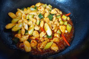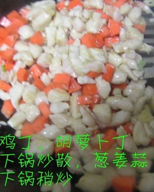 鸡丁胡萝卜丁下锅炒散,葱姜蒜下锅稍炒。