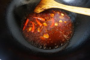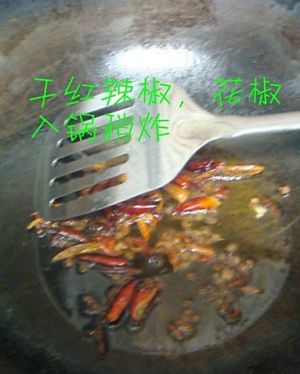 锅中放少许油,把干红辣椒、花椒入锅稍炸,待呈深红色,出香味时,捞出来不要。