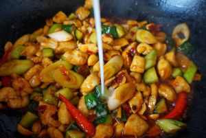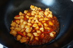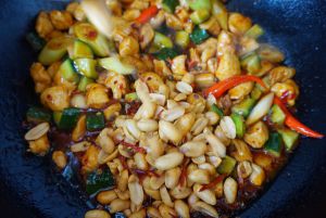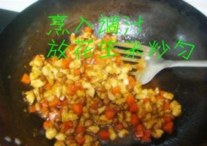 烹入兑好的调味汁,炒熟,花生米放入炒匀即可。