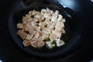 鸡肉切成丁,用少许精盐、料酒、湿淀粉浆上。
