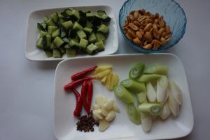大葱切段,姜蒜切好,花椒,辣椒备好。花生米我用的麻辣花生,你也可以自己用花生米炒熟。黄瓜切丁块。
