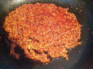 油入锅烧热,将花椒粒炸香捞出,加入姜末和肉末一起炒香,然后加孜然粉、花椒粉炒匀,再倒入放入红油豆瓣酱炒片刻