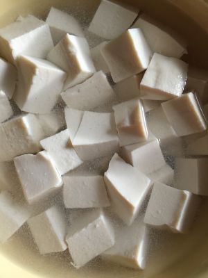豆腐切小丁,放淡盐水中浸泡一会儿