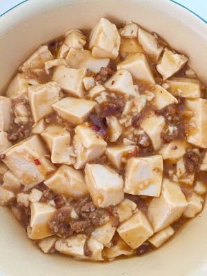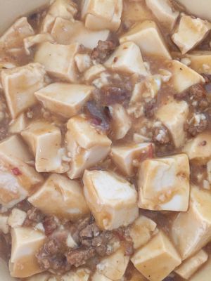 准备材料:豆腐切丁、牛肉切末、豆瓣酱、盐、酒、生红辣椒切碎、青蒜、姜末、花椒粉、水淀粉、酱油、少许糖。